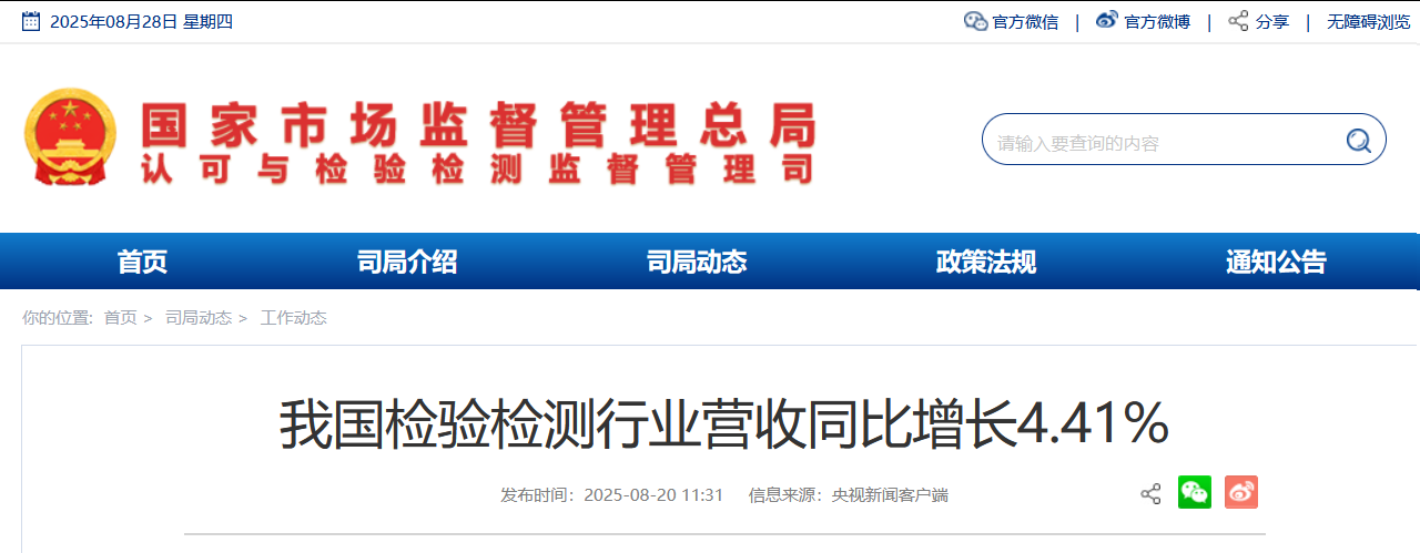 我國(guó)檢驗(yàn)檢測(cè)行業(yè)營(yíng)收同比增長(zhǎng)4.41%