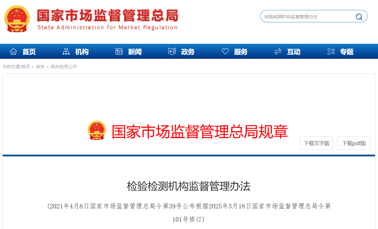 市場(chǎng)監(jiān)管總局正式發(fā)布修訂后的《檢驗(yàn)檢測(cè)機(jī)構(gòu)監(jiān)督管理辦法》第一條 為了加強(qiáng)檢驗(yàn)檢測(cè)機(jī)構(gòu)監(jiān)督管理工作,規(guī)范檢驗(yàn)檢測(cè)機(jī)構(gòu)從業(yè)行為,營(yíng)造公平有序的檢驗(yàn)檢測(cè)市場(chǎng)環(huán)境,依照《中華人民共和國(guó)計(jì)量法》及其實(shí)施細(xì)則、《中華人民共和國(guó)認(rèn)證認(rèn)可條例》等法律、行政法規(guī),制定本辦法。第二條 在中華人民共和國(guó)境內(nèi)檢驗(yàn)檢測(cè)機(jī)構(gòu)從事向社會(huì)出具具有證明作用的檢驗(yàn)檢測(cè)數(shù)據(jù)、結(jié)果、報(bào)告(以下統(tǒng)稱(chēng)檢驗(yàn)檢測(cè)報(bào)告)的活動(dòng)及其監(jiān)督管理,適用本辦法。法律、行政法規(guī)對(duì)檢驗(yàn)檢測(cè)機(jī)構(gòu)的監(jiān)督管理另有規(guī)定的,查看詳情>>