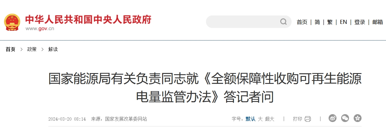 國家能源局有關(guān)負責同志就《全額保障性收購可再生能源電量監(jiān)管辦法》答記者問國家發(fā)展改革委于印發(fā)了《全額保障性收購可再生能源電量監(jiān)管辦法》(以下簡稱《辦法》),國家能源局有關(guān)負責同志接受采訪,回答了記者提問。 問:《辦法》印發(fā)的背景是什么? 答:原國家電力監(jiān)管委員會于2007年9月1日印發(fā)施行《電網(wǎng)企業(yè)全額收購可再生能源電量監(jiān)管辦法》(國家電力監(jiān)管委員會令第25號),有效規(guī)范可再生能源電量保障收購行為,為推動可再生能源規(guī)?;】蛋l(fā)展,實現(xiàn)清潔低碳發(fā)展目標發(fā)揮了重要作用查看詳情>>