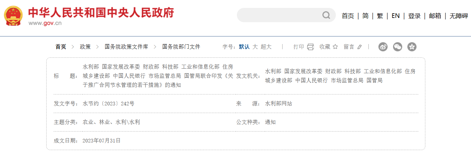 水利部 國(guó)家發(fā)展改革委 財(cái)政部等聯(lián)合印發(fā)《關(guān)于推廣合同節(jié)水管理的若干措施》水利部 國(guó)家發(fā)展改革委 財(cái)政部 科技部 工業(yè)和信息化部 住房城鄉(xiāng)建設(shè)部 中國(guó)人民銀行 市場(chǎng)監(jiān)管總局 國(guó)管局聯(lián)合印發(fā)《關(guān)于推廣合同節(jié)水管理的若干措施》的通知水節(jié)約〔2023〕242號(hào)各省、自治區(qū)、直轄市水利(水務(wù))廳(局)、發(fā)展改革委、財(cái)政廳(局)、科技廳(委、局)、工業(yè)和信息化主管部門、住房城鄉(xiāng)建設(shè)廳(委、管委、局)、人民銀行上??偛俊⒏鞣中?、營(yíng)業(yè)管理部、各省會(huì)(首府)城市中心支行、各副省級(jí)城市中查看詳情>>